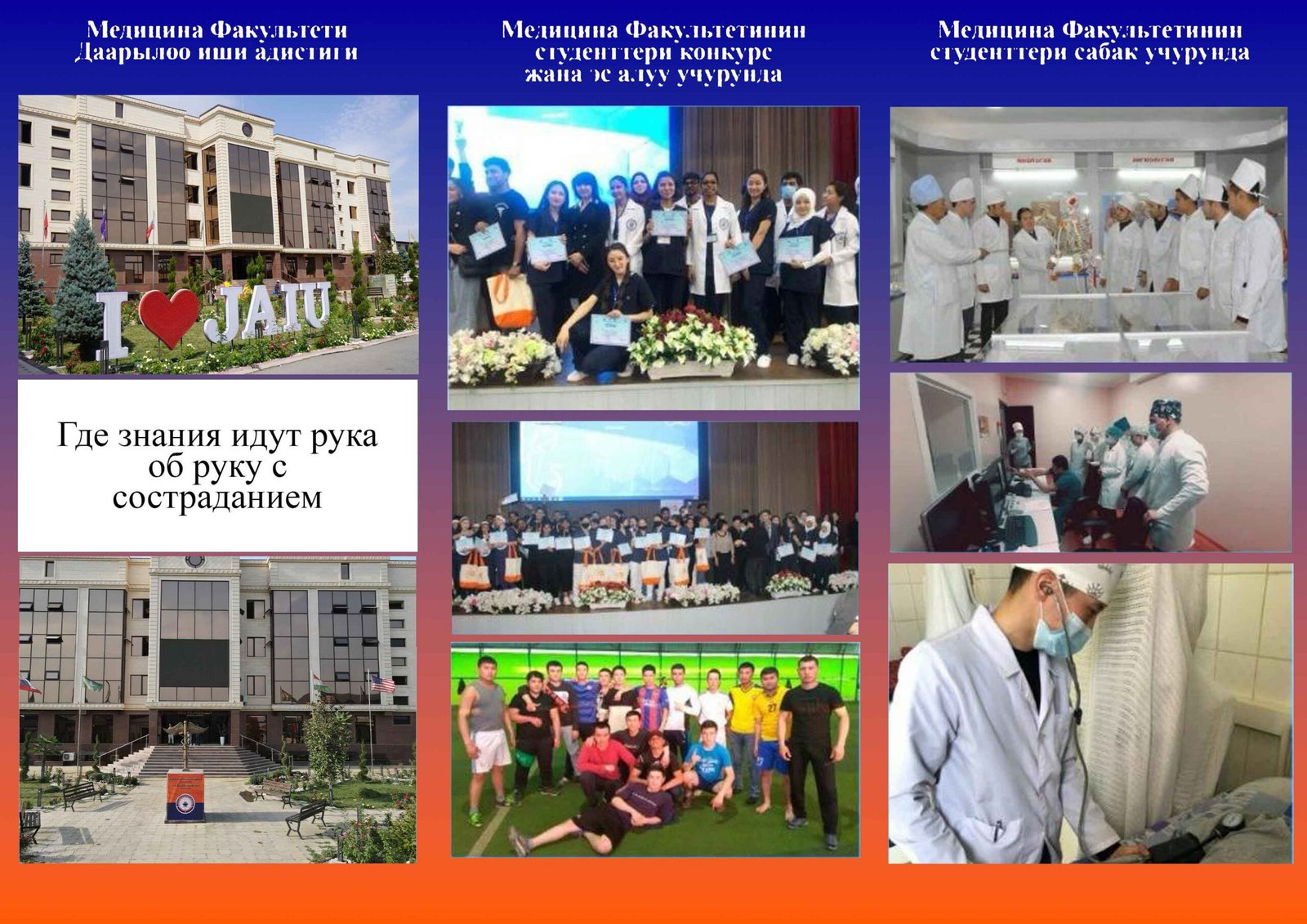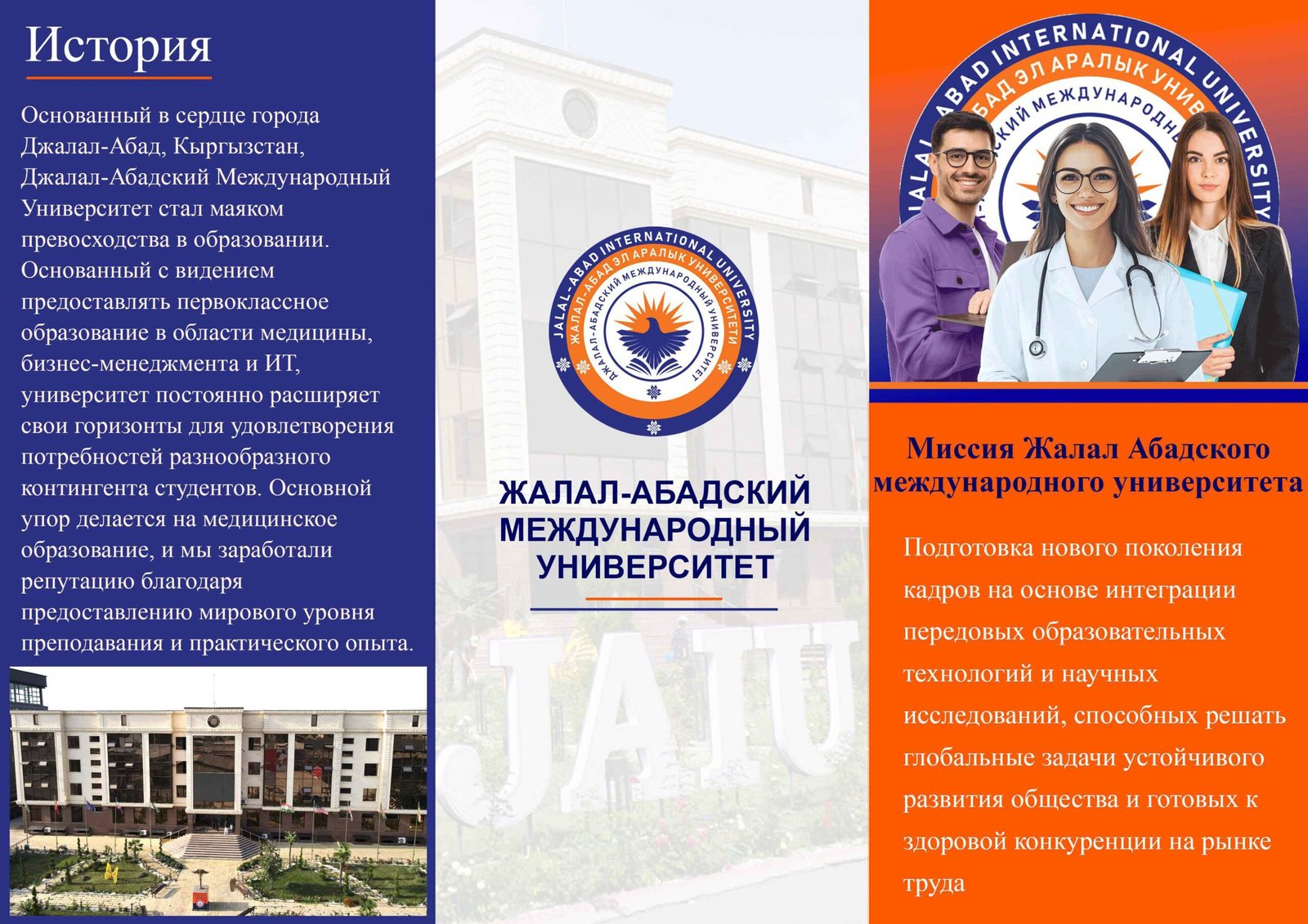 В Жалал-Абадском Международном Университете мы стремимся предоставить образование, которое не только передает знания, но и воспитывает сострадание. Мы приглашаем вас присоединиться к нашему сообществу и отправиться в путь открытия, роста и достижений.